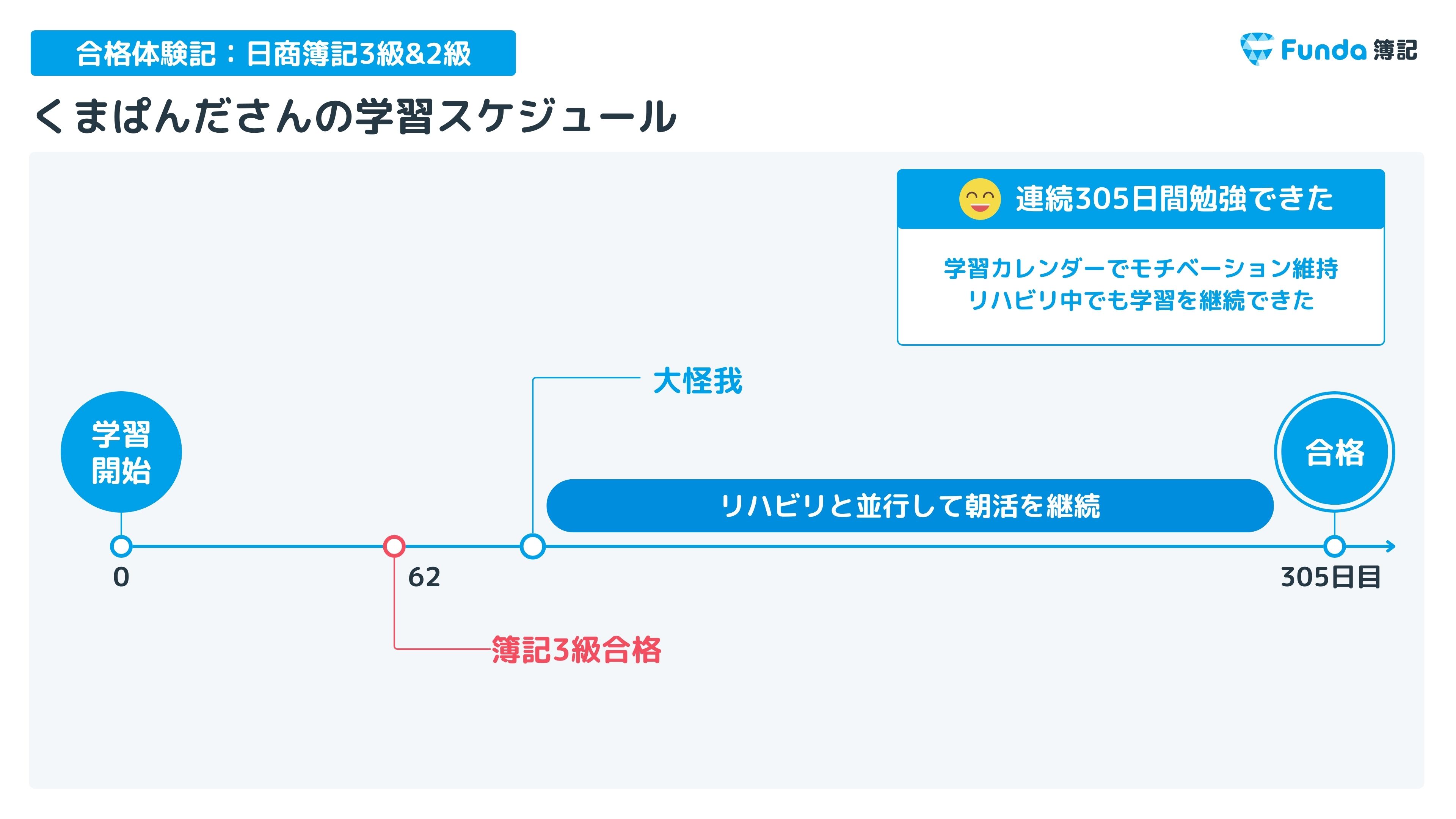 途中、大怪我をしたり、そのリハビリ期間や仕事の繁忙期もありましたが、3級の勉強開始から2級合格まで、305日間連続で学習を続けることができました。最後は朝活だけでなく、夜の自由時間にも勉強していました。