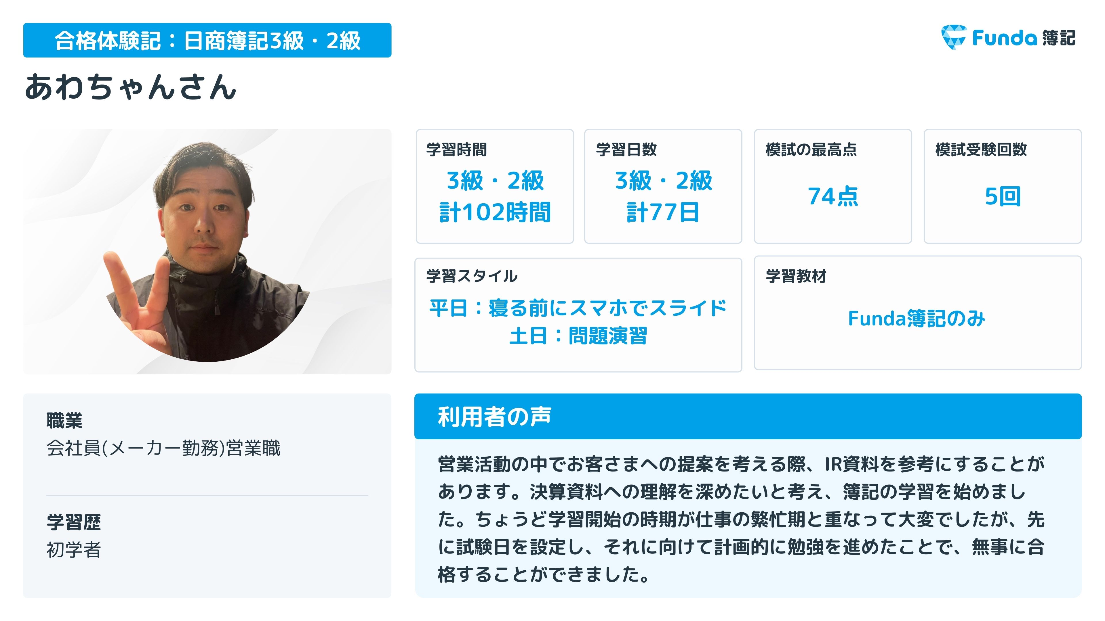 今回は、そんな悩みを持ちながらも多忙な営業職として働く中で、顧客のIR資料を深く理解したいという思いから簿記2級に挑戦し、見事合格されたあわちゃんさんの体験記をご紹介します。