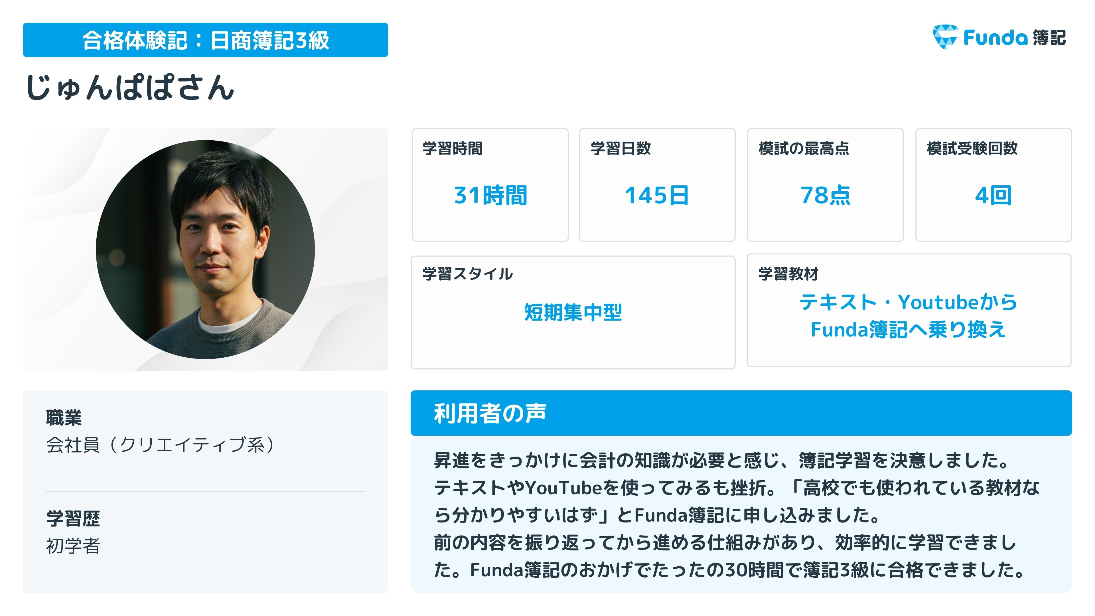今回は、2025年8月に簿記3級に合格された会社員のじゅんぱぱさんにお話を伺いました。