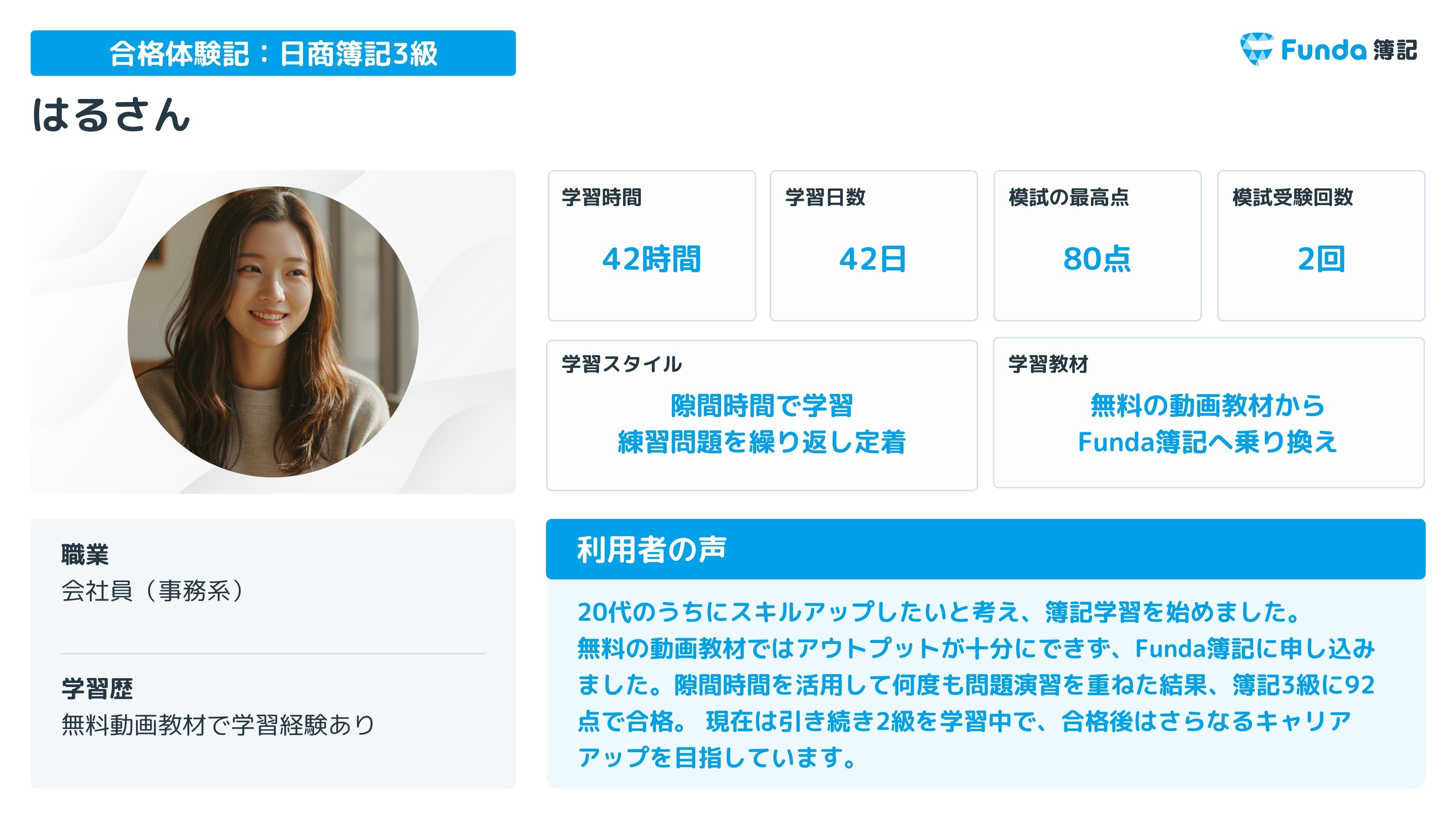 今回ご紹介するのは、資格取得が初めてだったはるさんが、Funda簿記を使い約40日・ほぼスマホのみ、隙間時間のみで簿記3級に92点合格した体験談です。通勤中はもちろん、エレベーター待ちの数十秒でも問題を解いていたという徹底した時間活用が印象的でした。