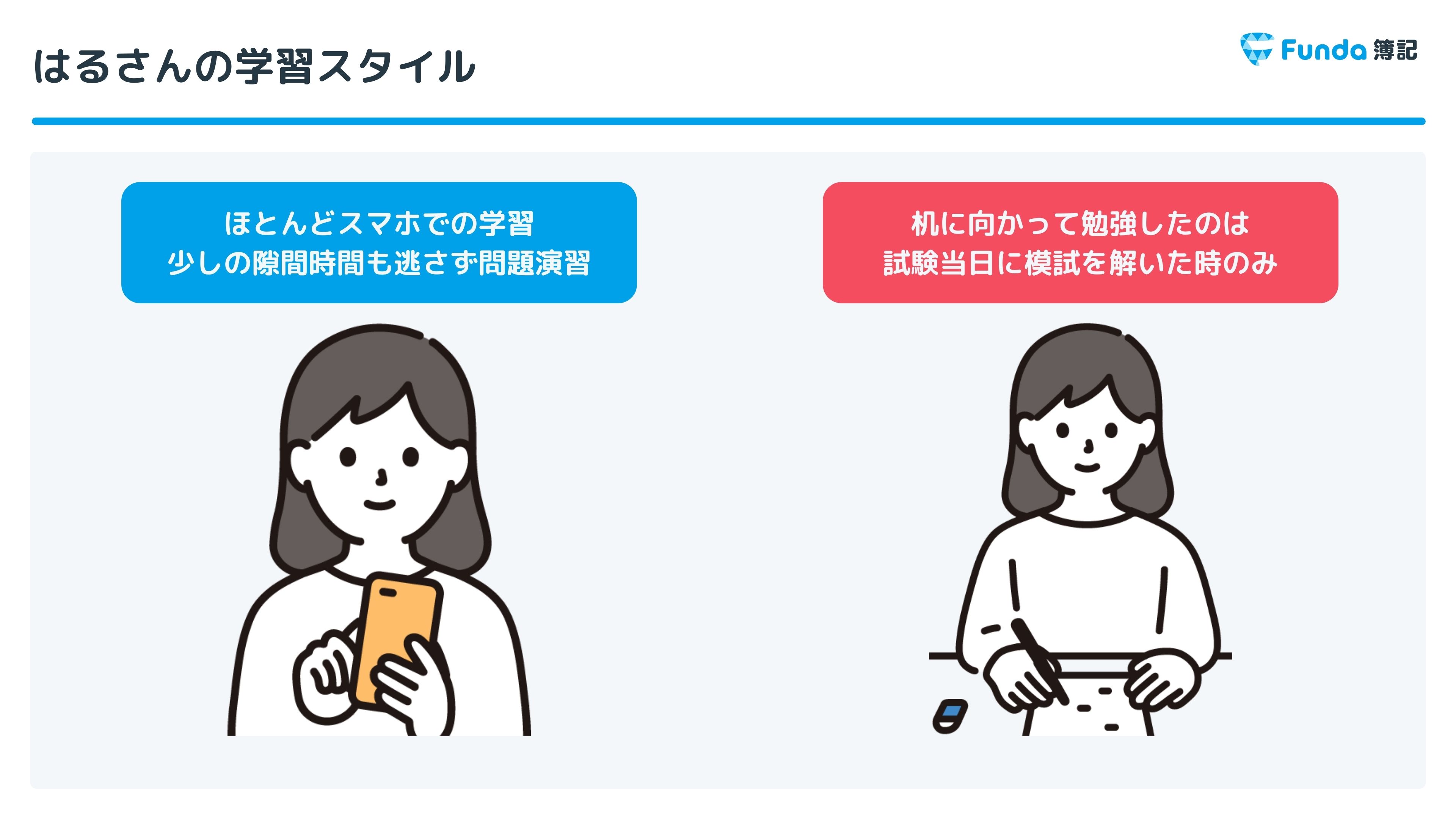 Funda簿記だとスマホで問題も解けるので、意外と勉強できるものですよ。